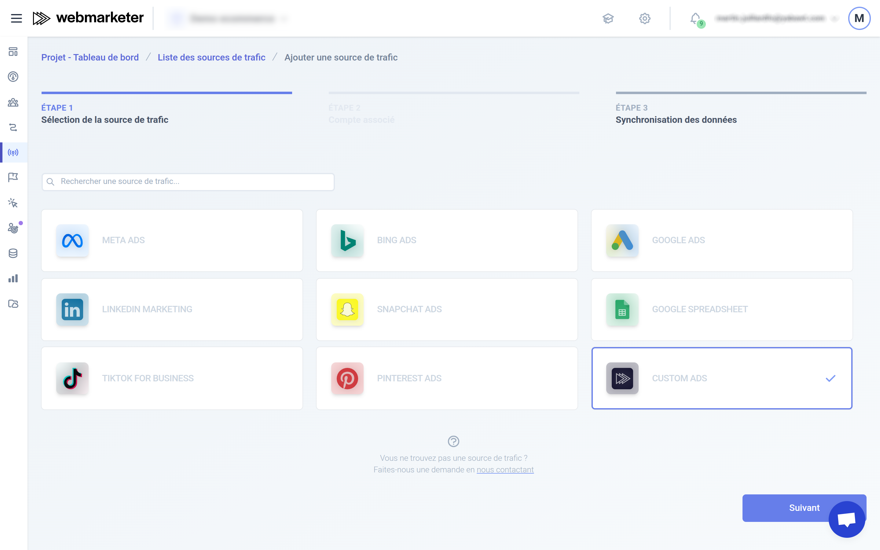 Pour commencer, sélectionnez le type de source "Custom Ads".